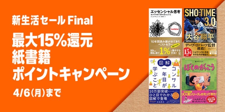 - 最大15%ポイント還元「読書の秋 紙書籍ポイントキャンペーン」(4/6まで)