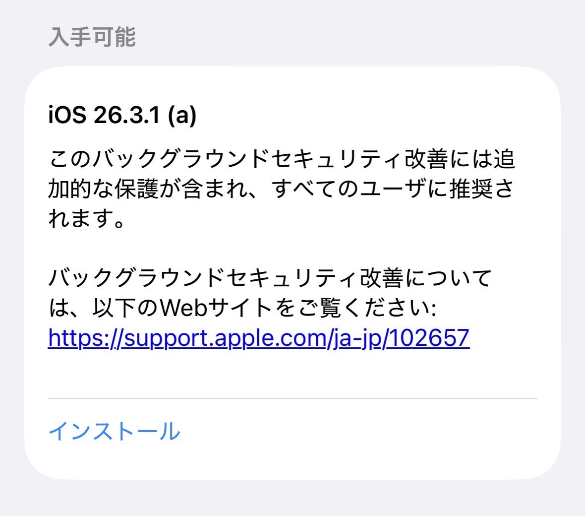 Appleが、バックグラウンドセキュリティ改善アップデート「iOS 26.3.1 (a)」をリリースしました。