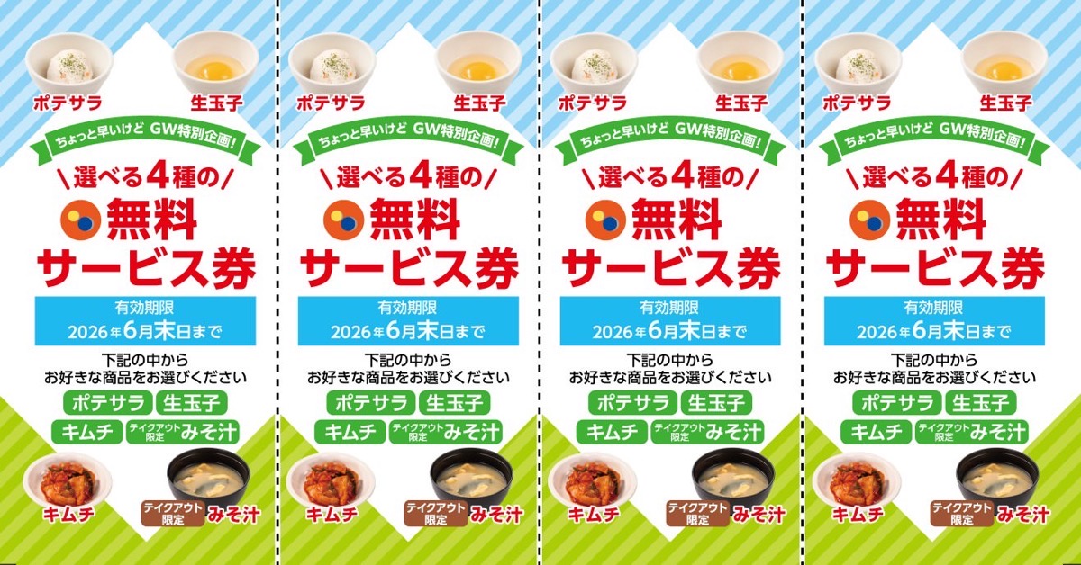 内容:テイクアウトの牛丼並盛を2個、3個、4個購入時にキャンペーン価格で提供します。